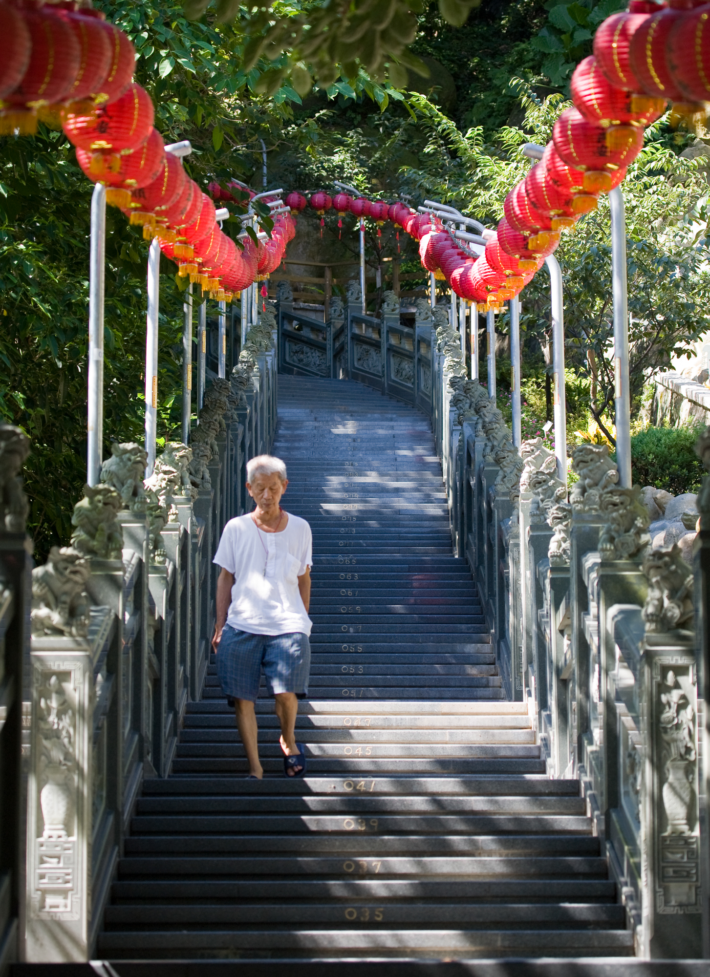 man walking down stairs at temple